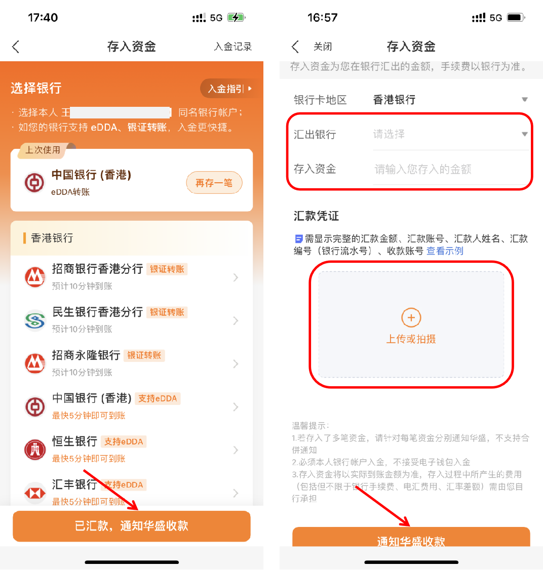 5.完成汇款后,登入华盛通APP通知华盛收款,点击【我的】—【证券业务】—【存入资金】—【已汇款,通知华盛收款】,对应填写汇出银行和存入资金,上传汇款凭证和银行帐户凭证,然后点击【通知华盛收款】