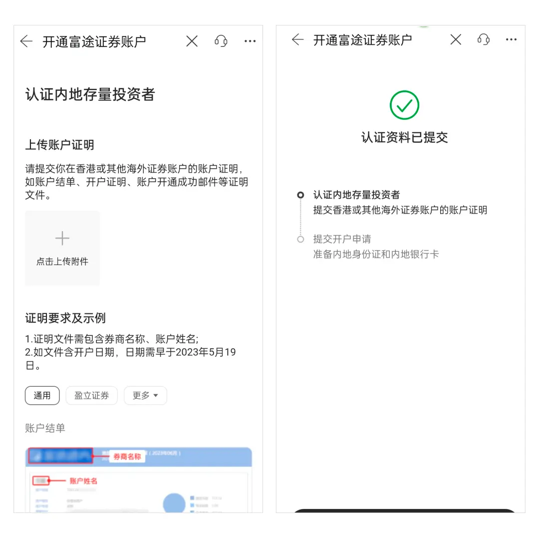 选择「内地存量投资者开户」后,首先需要认证您的内地存量投资者身份,即上传香港或其他海外证券账户的账户证明文件,并进行内地银行卡验证。