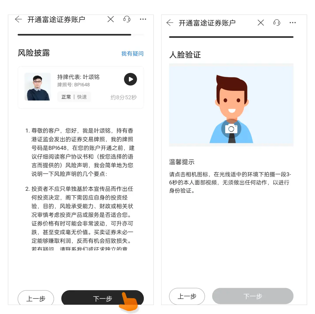 资料填写完成后,选择需要开通的账户类型,仔细阅读风险披露,进行人脸识别,提交电子签名,完成开户申请。